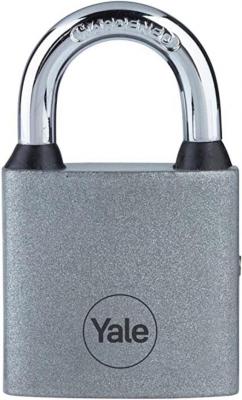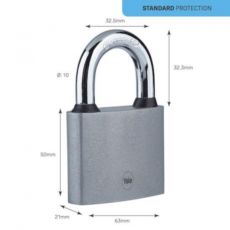 Visiaci zámok Yale so šírkou 63 mm so štandardnou úrovňou zabezpečenia. Železná konštrukcia disponuje tvrdeným strmeňom, ktorý zabraňuje prerezaniu. Odolný zámok testovaný na 10 000 cyklov (otvorenie a zatvorenie) pre optimálny výkon. Balenie obsahuje 3 ks kľúčov.