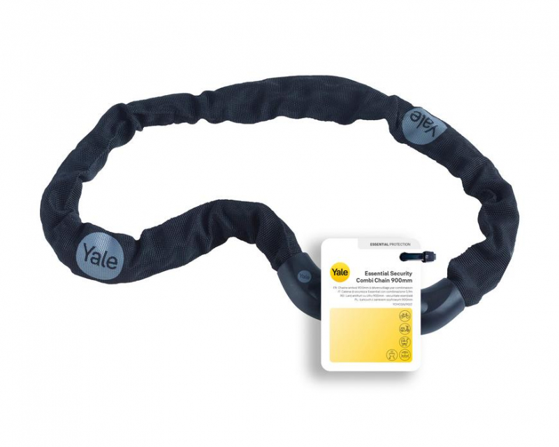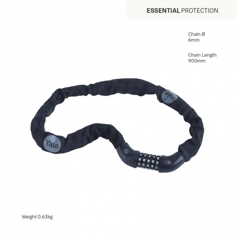 Reťazový zámok na bicykel Yale na kód. Reťaz vyrobená z uhlíkovej ocele. Odolný voči poveternostným vplyvom. Hrúbka reťaze: 6 mm. Dĺžka oceľovej reťaze: 90 cm.