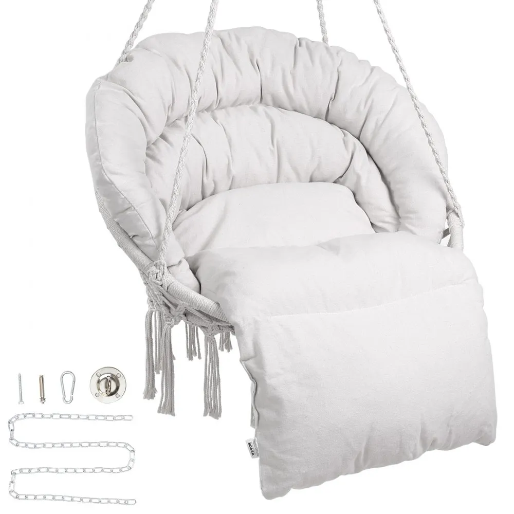 Závesné kreslo, nosnosť 150 kg, závesné kreslo z makramé s vankúšom a montážnym materiálom, hojdacie kreslo z bavlneného lana do spálne, na balkón, na terasu, do záhrady, béžové
