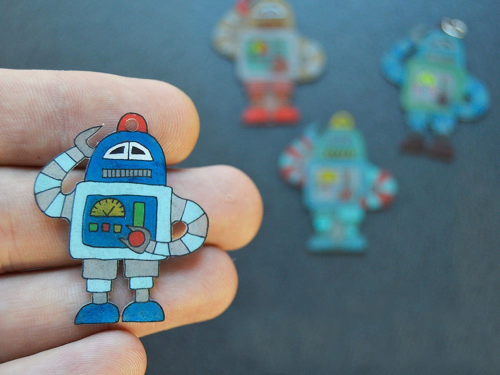 Jednoducho obkreslite vzor z priložených šablón na matnú stranu špeciálnej termofólie a vyfarbite ho. Potom vystrihnite obkreslený tvar (alebo si vytvorte vlastné jedinečné vzory podľa svojej fantázie). Po príprave vybraných vzorov ich vložte do rúry predhriatej na 160 °C (300 °F) na približne 2 – 3 minúty (počas tejto doby sa fólia zmrští a stuhne). Svoje ručne vyrobené dekorácie si budete môcť vychutnať raz-dva.