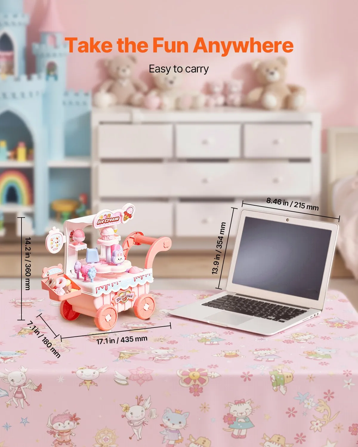 Ľahko sa premiestňuje: Vďaka pohodlnej rukoväti a hladko sa otáčajúcim kolieskam môžu deti tlačiť svoj zmrzlinový vozík kamkoľvek! Či už v interiéri alebo exteriéri, budú si užívať predstieranie, že predávajú zmrzlinu a hranie sa s kamarátmi na obchod.