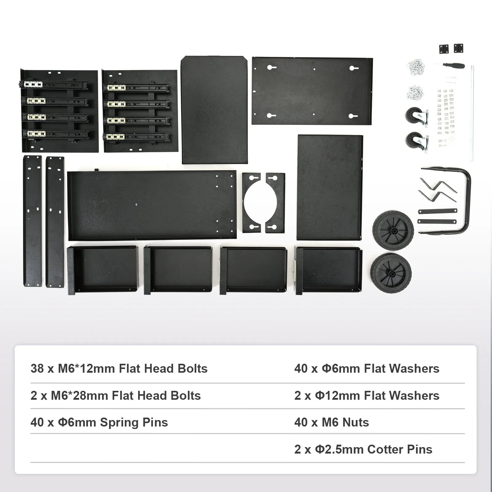 Prémiová kvalita a jednoduchá inštalácia: Tento zvárací vozík je vyrobený z odolnej ocele, ktorá ponúka výnimočnú pevnosť a odoláva ťažkým nákladom. Je odolný voči oderu a nedeformuje sa, čo zaisťuje plynulý pohyb. Presné umiestnenie otvorov umožňuje jednoduchú a rýchlu montáž. Rozmery horného priestoru: 27,8 x 45,7 cm; Rozmery spodného priestoru: 40 x 71 cm; Maximálna statická nosnosť: 120 kg; Maximálna dynamická nosnosť: 100 kg.