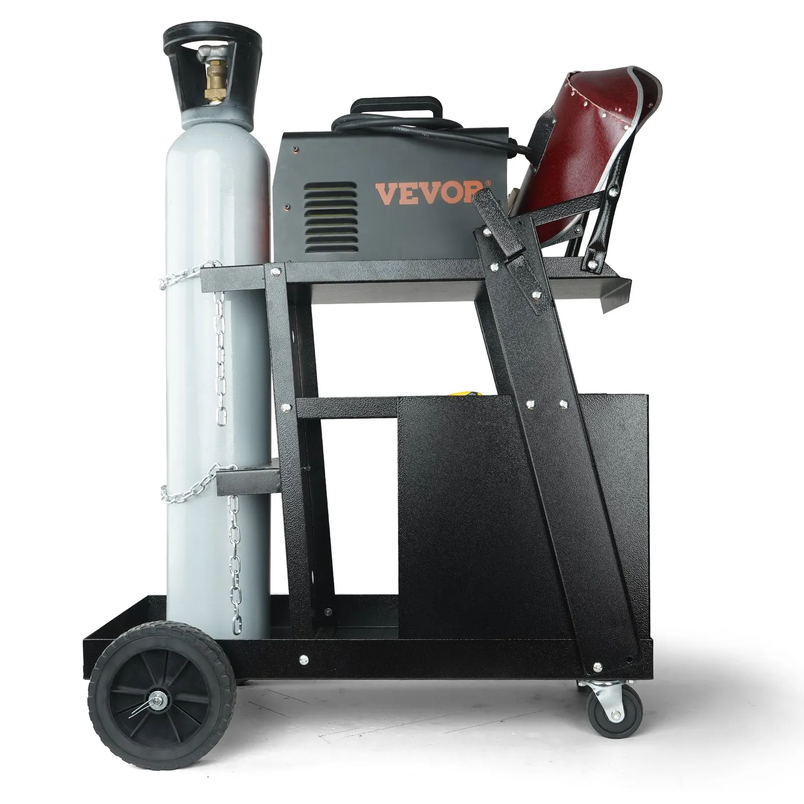 Zvárací vozík, 2 police so 4 zásuvkami, mobilný zvárací vozík s nosnosťou max. 100 – 120 kg pre zváracie zariadenia s 2 držiakmi na plynové fľaše, ideálny na ručné zváranie, zváranie v ochrannej atmosfére a argónové oblúkové zváranie.