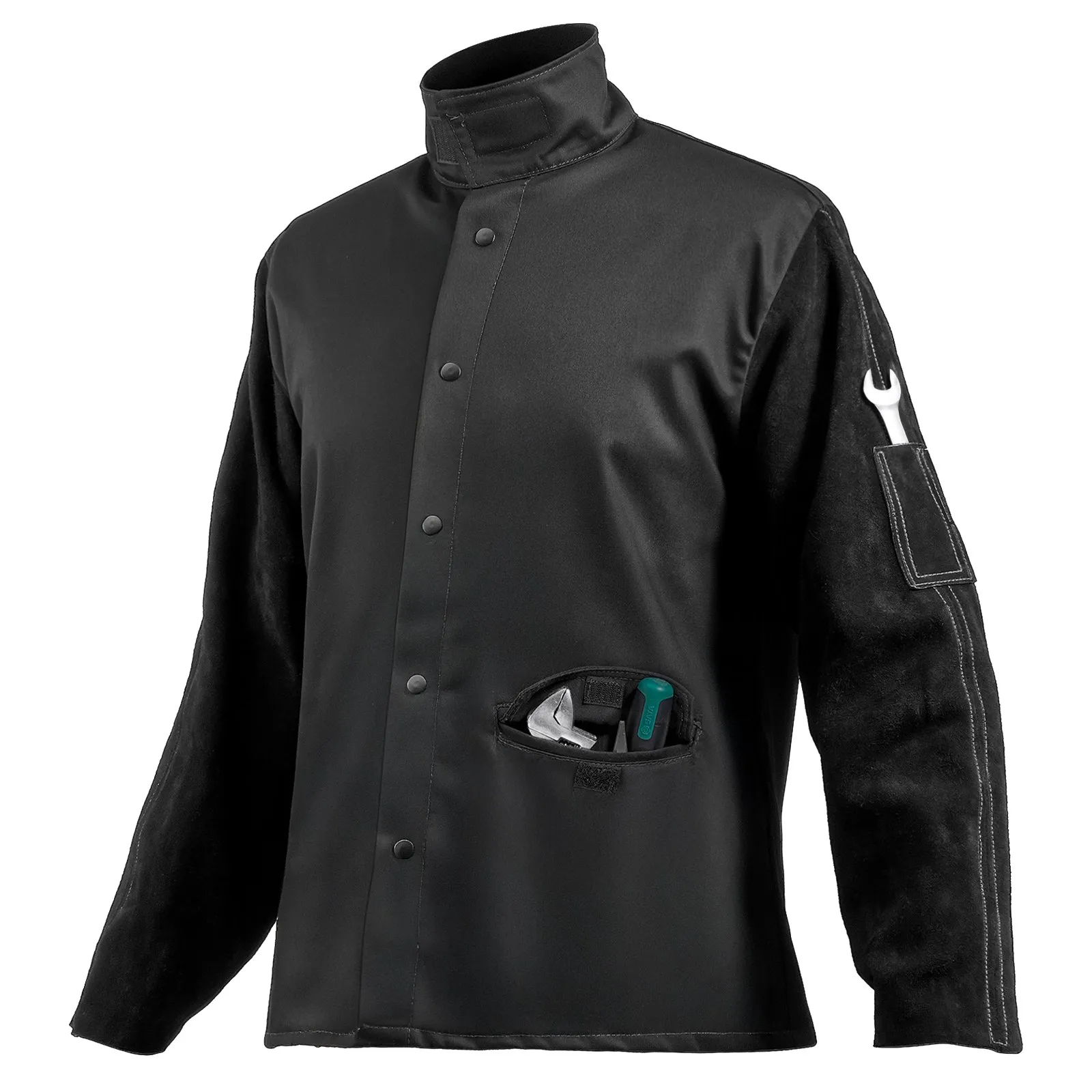 Vynikajúca odolnosť voči ohňu: Naša zváračská bunda je vyrobená z odolnej štiepanej hovädzej kože a ohňovzdornej 273 g čistej bavlny. Rukávy z hovädzej kože vás chránia pred iskrami a plameňmi a ohňovzdorná bavlna na hrudi a chrbte zaisťuje pohodlie a priedušnosť. Spĺňa normu ATPV pre oblúkový výboj 9,2 cal/cm² pre bezpečnejšie zváranie.