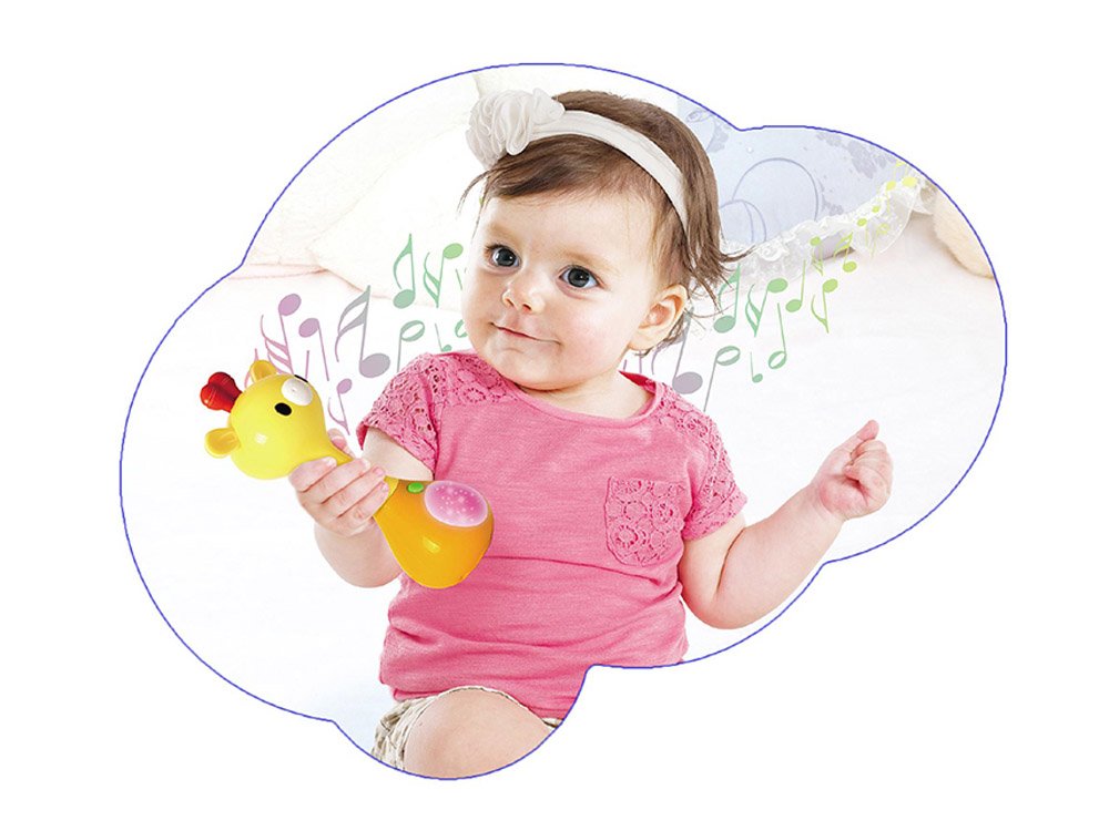 Interaktívna hrkálka v tvare činky sa výrazne líši od tradičných hrkálok. Namiesto bežného hrkavého zvuku budete počuť príjemnú melódiu.